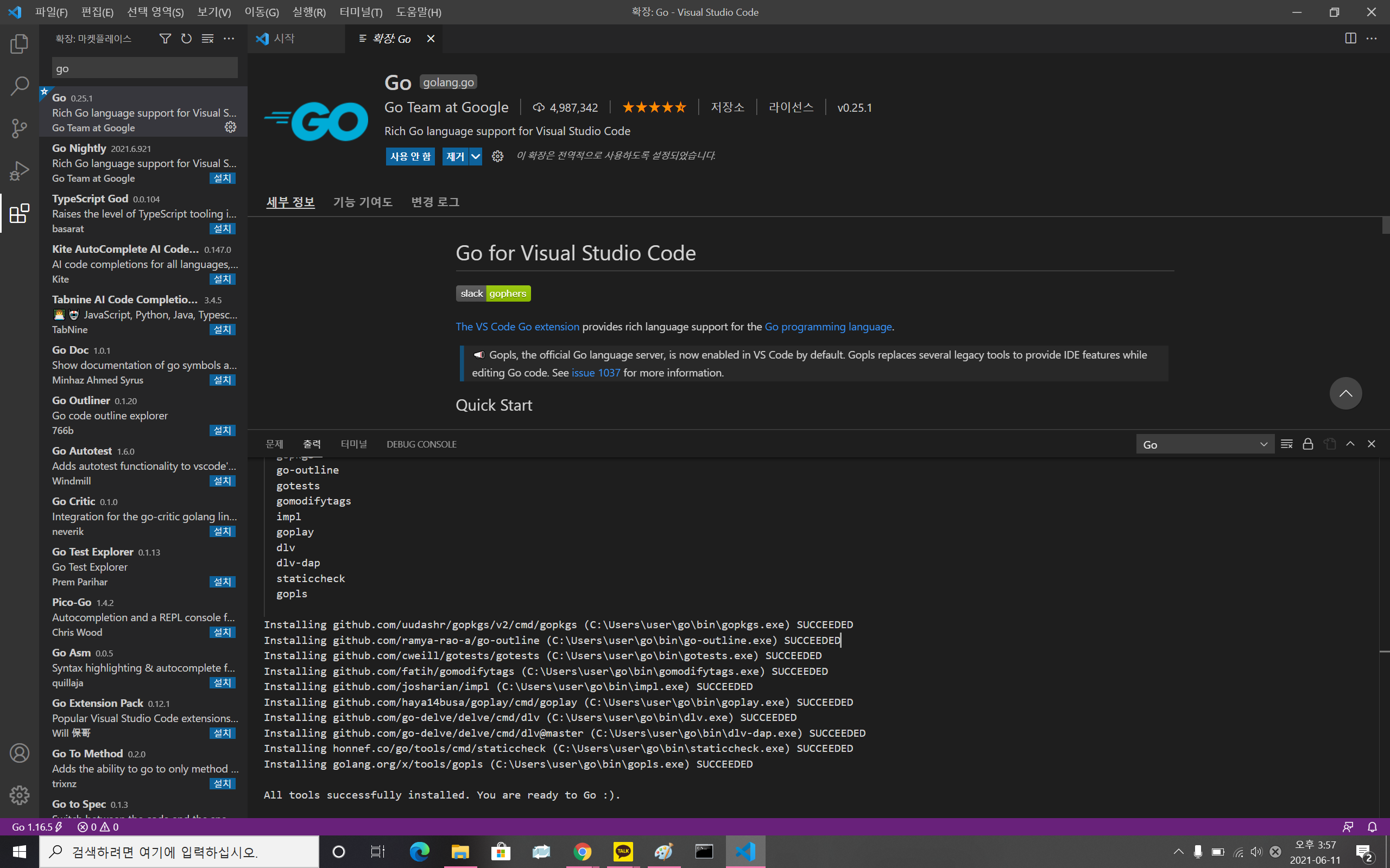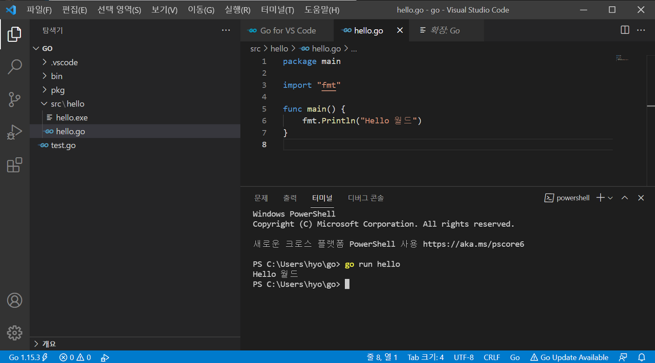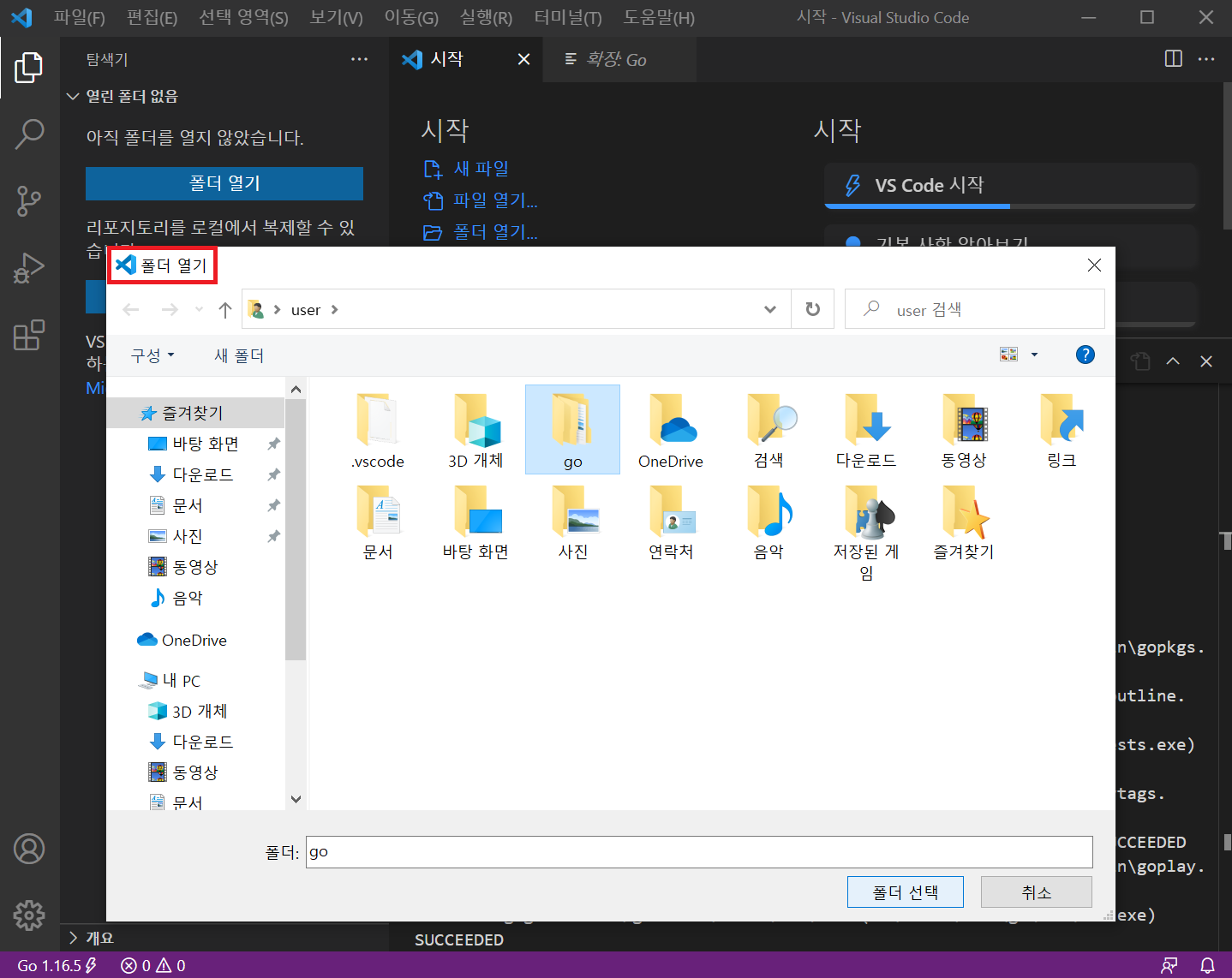 이렇게 폴더를 열고 실행하고, bin,pkg, src, main.go파일을 만들고 실행하면
