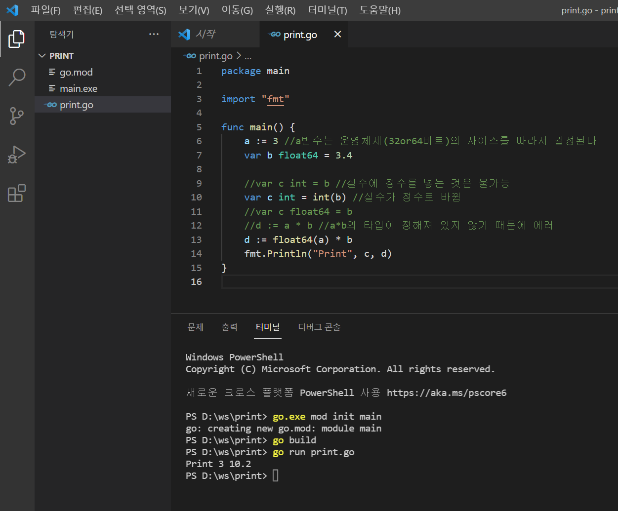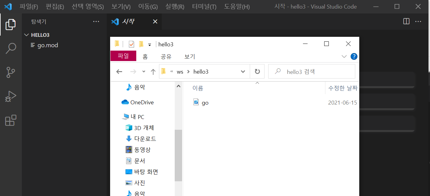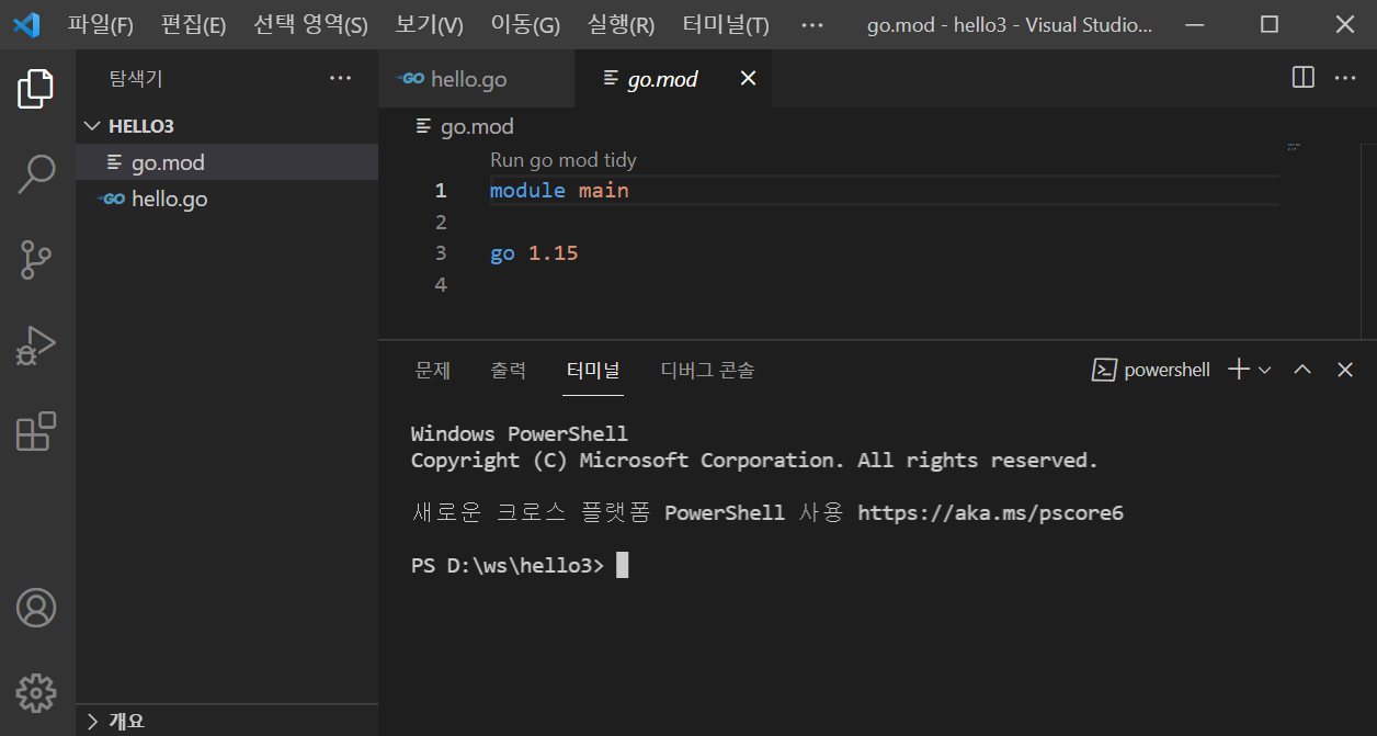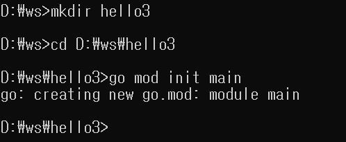 전에 cmd에서 go mod init main까지 입력했었고