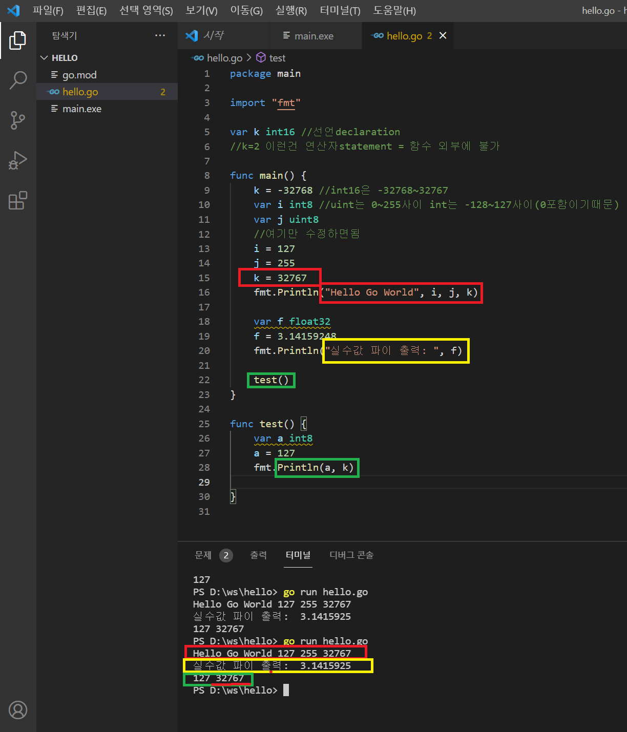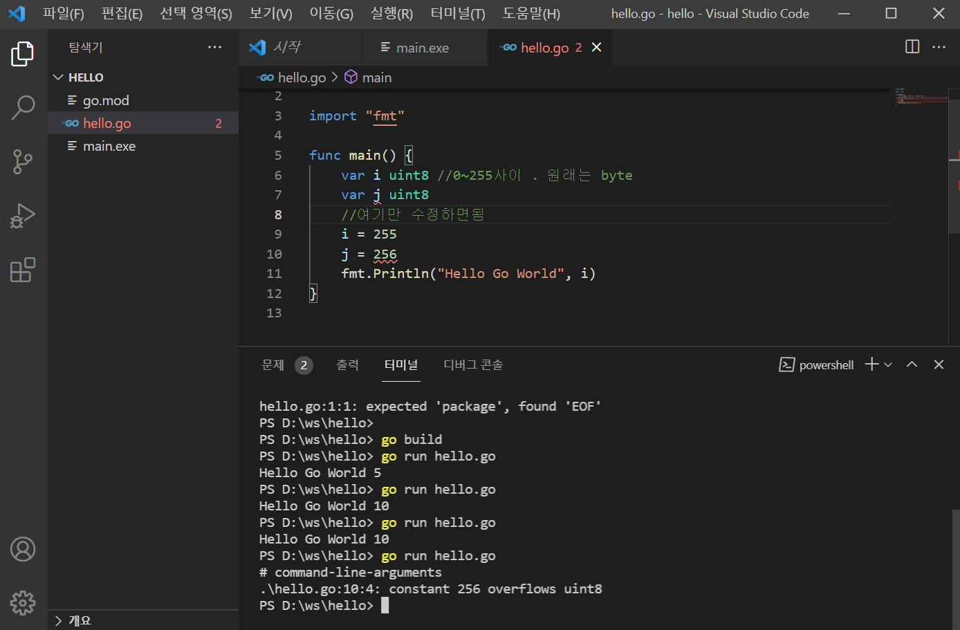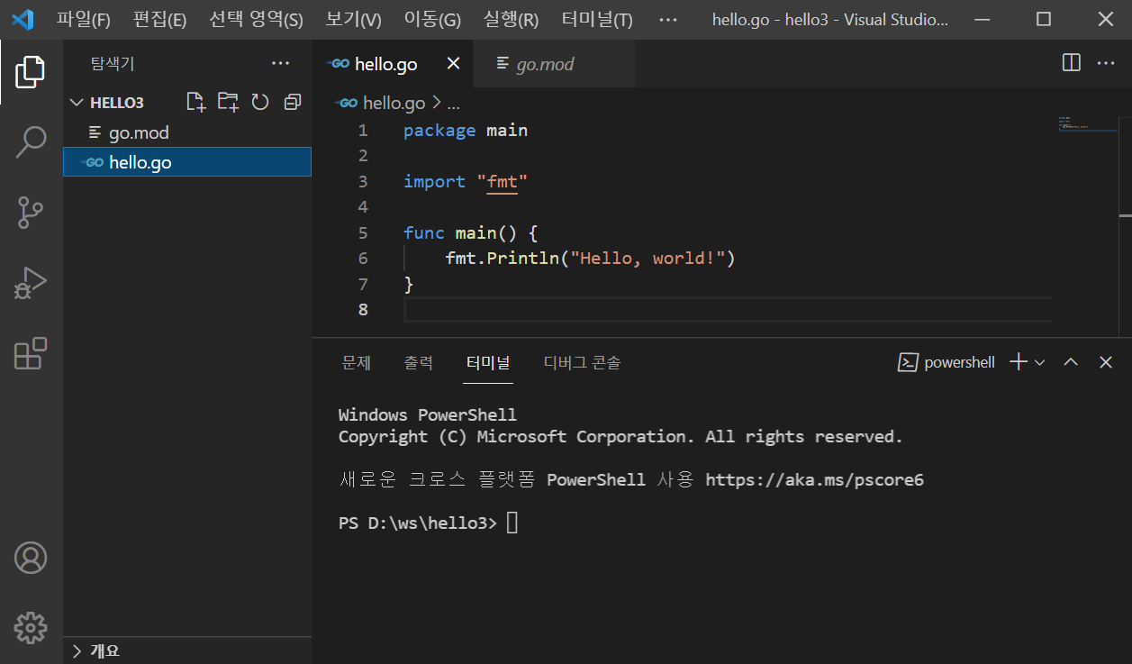 터미널에서 hello.go로 갑니다! (아래 코드 있어요)