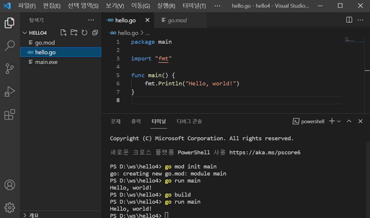 (go build를 안하면 Hello, world!는 뜨지만 .exe파일이 만들어지지 않아요)