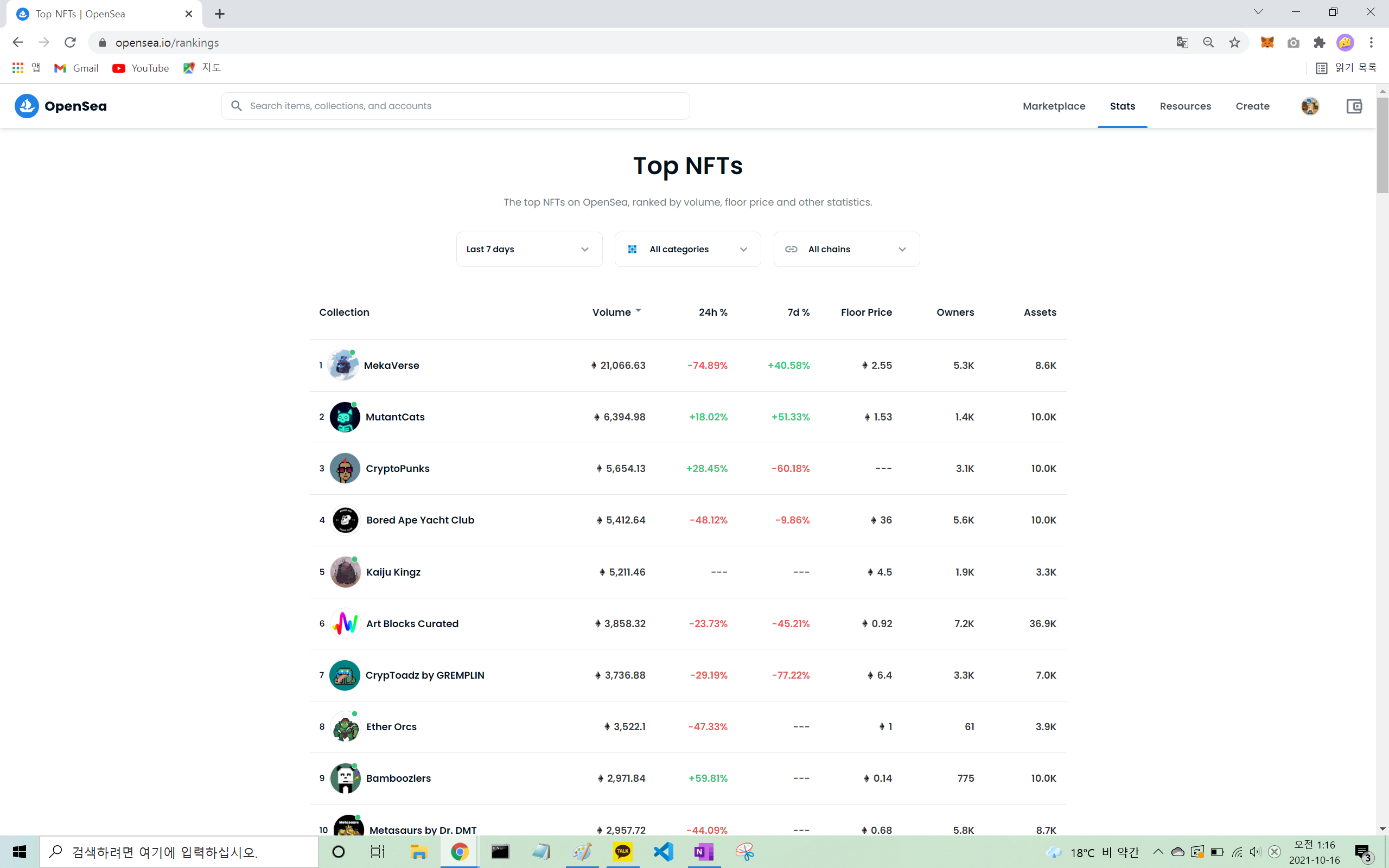랭킹에는 이더리움 Volume, 추세, floor price(최저가), Owners(얼마나 많은 사람들이 가지고 있는지), 자산이 표기되어 있다.