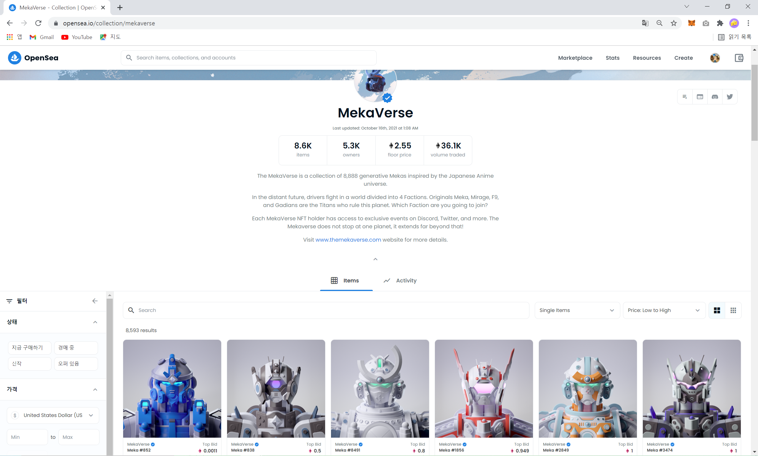 Stats의 ranking이 있어 1위인 MekaVerse를 들어가봤다. 일본 애니메이션 세계관에서 영감을 받았다는 것 같은데, 미래에 4개의 파벌과 우주를 지배하는 가디언들로 이루어진 세계관을 테마로 Meka를 게임 캐릭터처럼 판매하고 있었다.