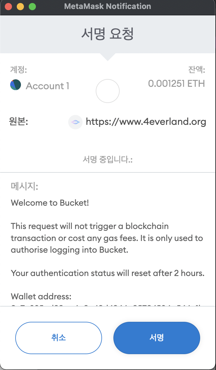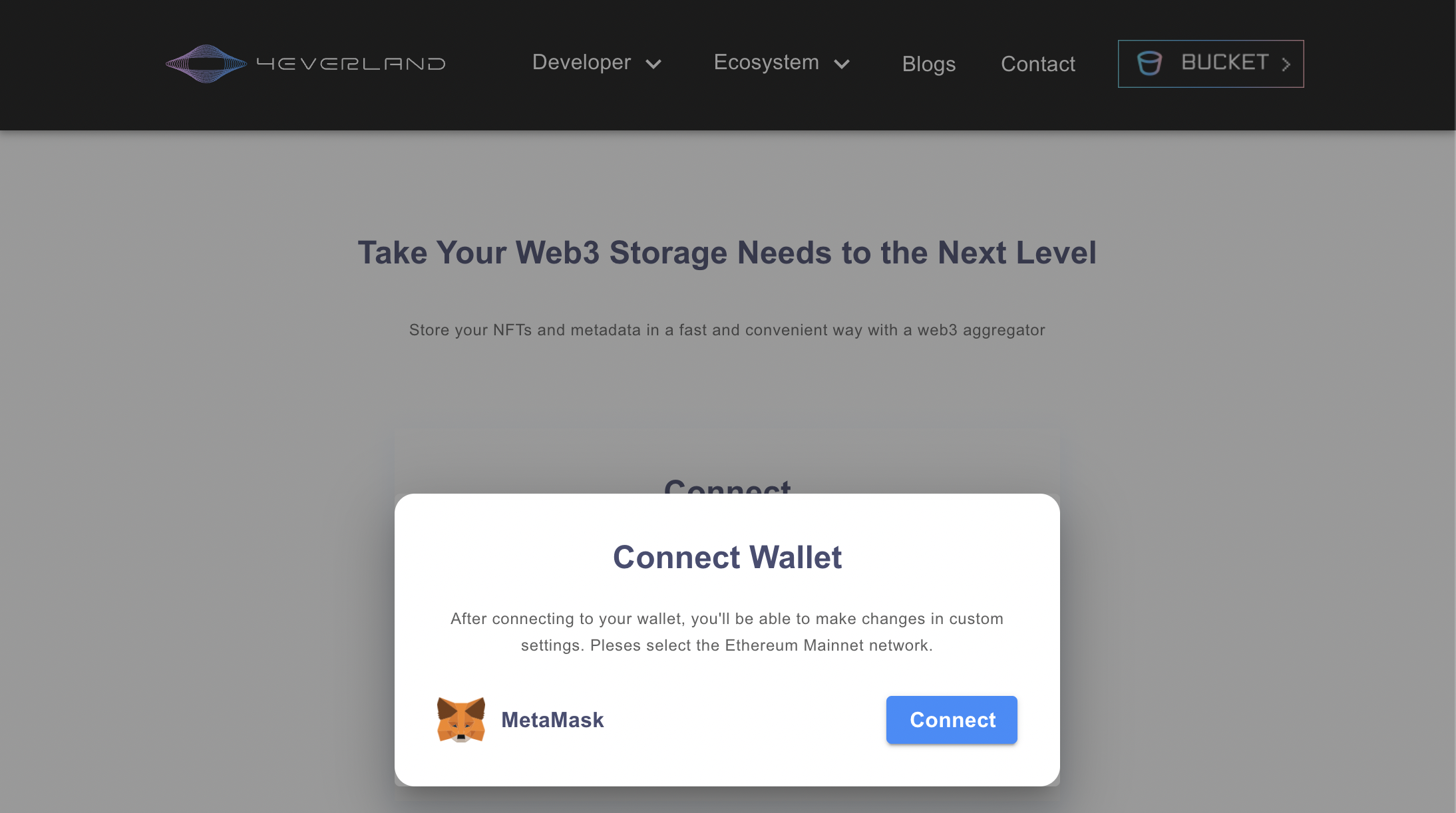 4. 메타마스크에 로그인하면 다음과 같은 버킷 생성화면이 뜬다.